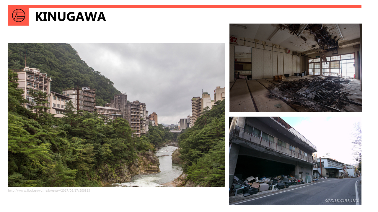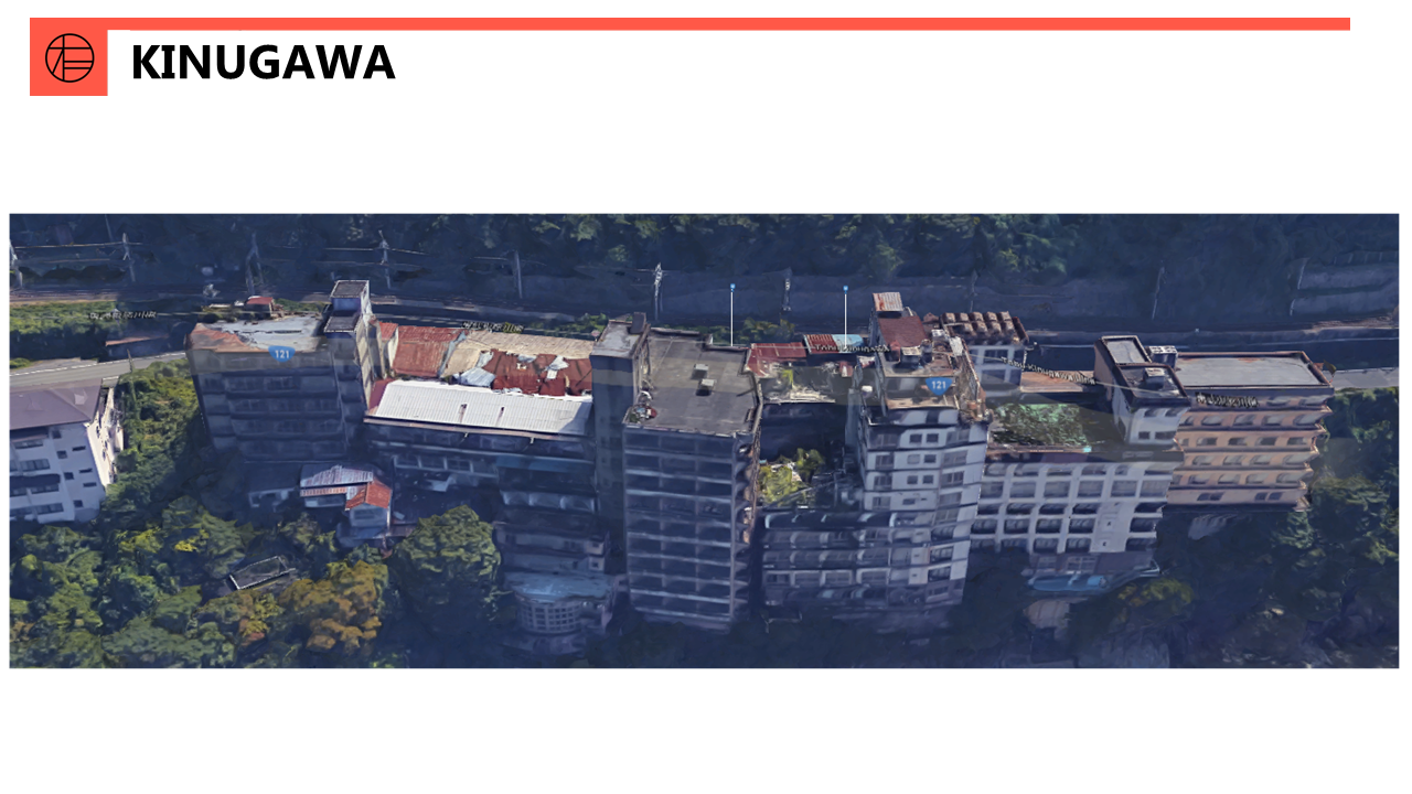 In the 1970’s, a region in the far corner of the Kinugawa River in Tochigi, Japan was elaborately developed as a vacation spot, popular for its beautiful nature and hot springs. However, because of the economic crash in 1991, the entire area decayed into nothing but hollowed hotels and memories of a once lively tourist hub.